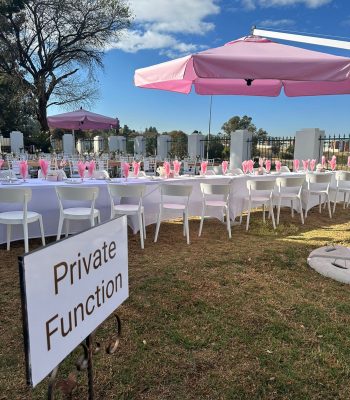 Option 1: Pergola awning max 30 pax (Includes tables, table cloths, chairs, cutlery, glasses and napkins) | R2050 | 10:00-13:00, 11:00-14:00, 12:00-15:00 (12:00-15:00 not available Sundays) |
